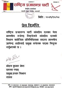 काठमाडौं । राष्ट्रिय प्रजातन्त्र पार्टी (राप्रपा) ले प्रतिनिधि सभा सदस्य ज्ञानेन्द्र शाहीलाई प्रमुख सचेतक बनाएको छ ।