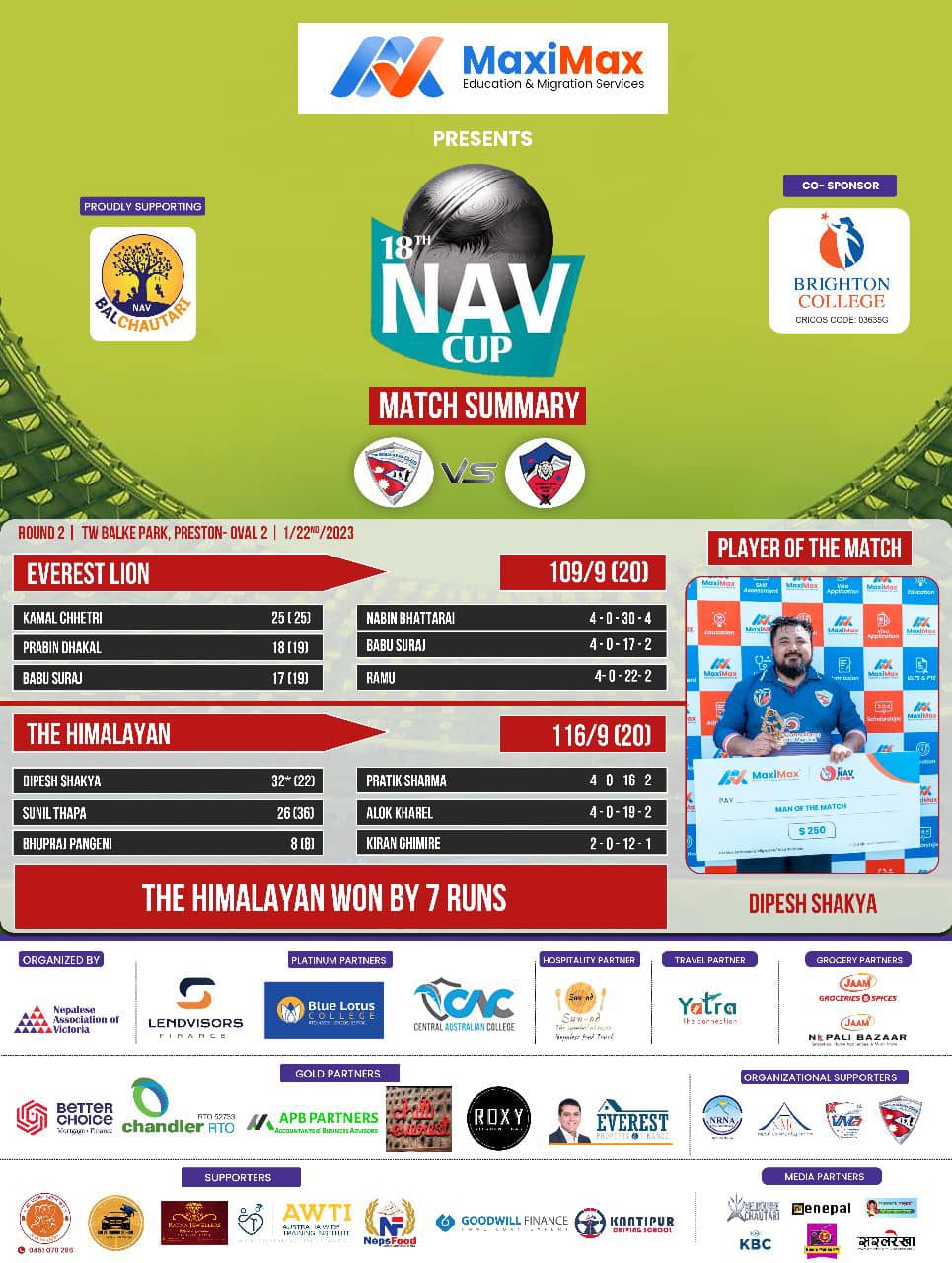 त्यस्तै एभरेष्ट लायन र द हिमालयन वीचको खेलमा द हिमालयनले ७ रनले जित निकाल्यो । द हिमालयनले दिएको ११६ रनको लक्ष्यलाई एभरेष्टले भेटाउन सकेन ।