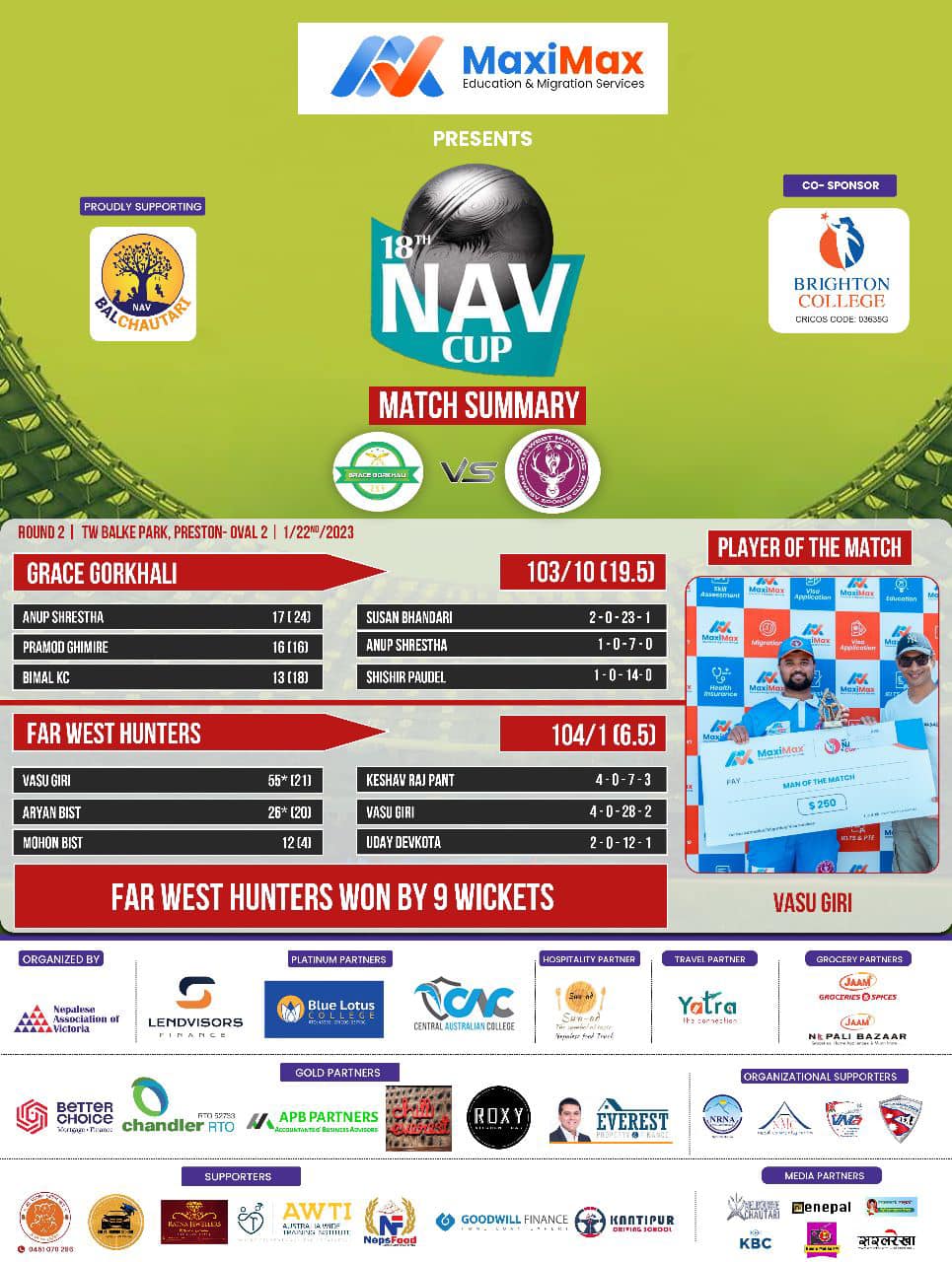 ग्रेस गोर्खाली र फार वेस्ट हन्टर्सवीचको खेलमा भने फार वेस्ट हन्टर्सले ९ विकेटले जित निकाल्यो । ग्रेस गोर्खालीले दिएको १०३ रनको लक्ष्य फार वेस्टर्नले ९ विकेट बाँकी रहदै भटायो ।