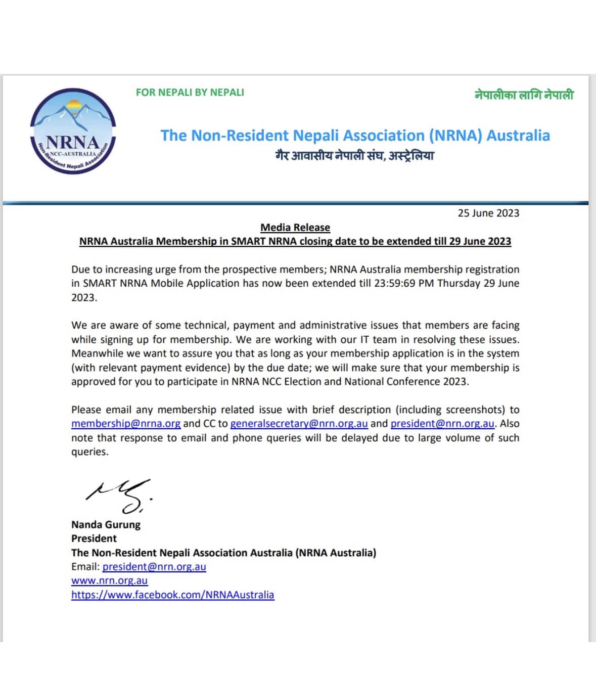 आइतवार एनआरएनए अष्ट्रेलियाका अध्यक्ष नन्द गुरुङले एक मिडिया सन्देश जारी गर्दै सदस्य बन्न चाहनेहरुको लागि थप ४ दिनको समय थपिएको जानकारी गराएका हुन् ।