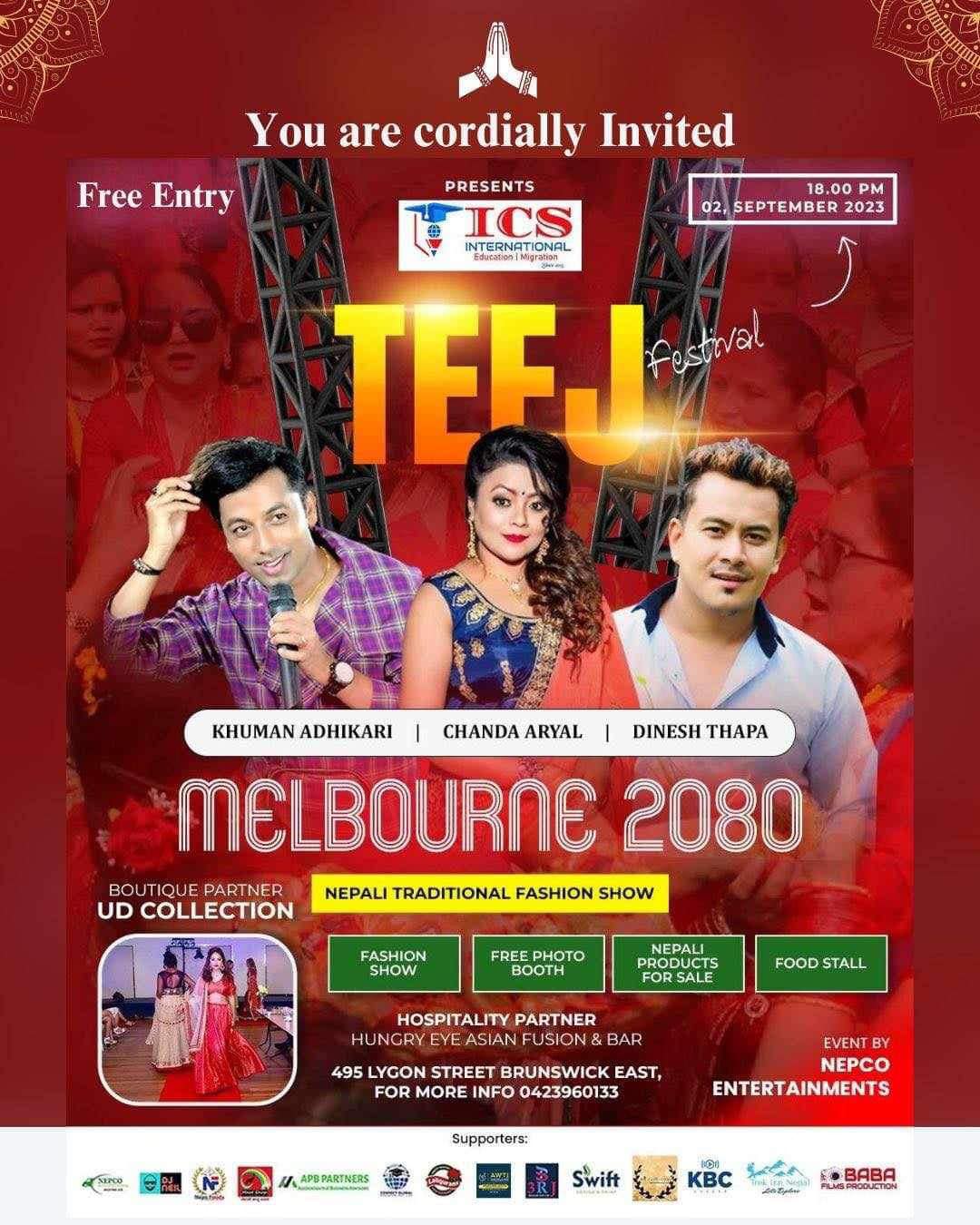साँझ ६ बजेबाट शुरू हुने उक्त कार्यक्रममा फेशन सो समेत हुने भएको छ । हंग्री आइ एसियन फ्युजन हस्पिटालिटी पार्टनर रहेको उक्त कार्यक्रममा नेपाली सामग्रीहरु बिक्री गरिने छ । यस्तै नेपाली फुड स्टल र निशुल्क फोटो बुथको पनि व्यवस्था गरिएको छ । कार्यक्रममा सहभागि हुनको निम्ती खुमन शुक्रवार मेलवर्न आइपुगेका छन् । चन्दा र दिनेशभने यसअघि नै मेलवर्न आइसकेका छन् ।