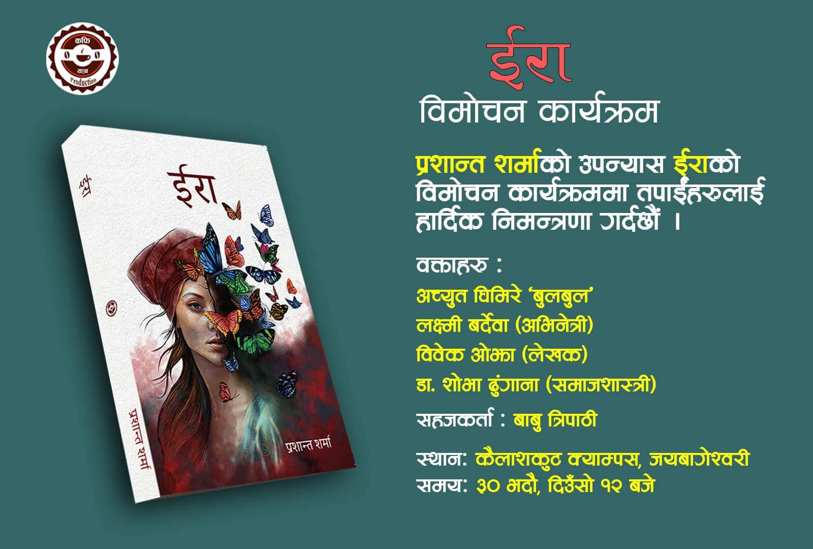 प्रशान्त शर्मा द्वारा लिखित ईरा उपन्यास काठमाडौंमा शनिवार विमोचन गर्न लागिएको प्रोडक्सनका सञ्चालक कृष्ण पिडी सापकोटाले जानकारी दिए ।