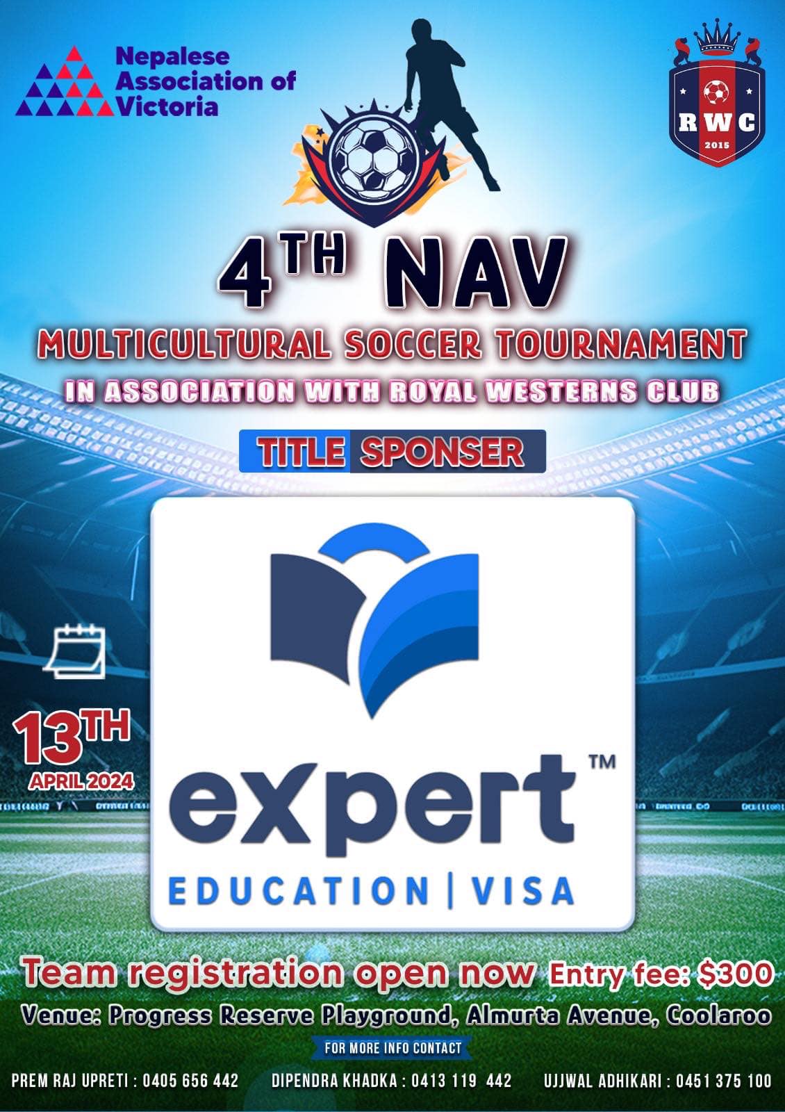 एक्सपर्ट एजुकेशन एन्ड भिजा सर्भिसेसको मुख्य प्रायोजनमा यही १३ अप्रिलको दिन चौथो मल्टीकल्चरल सकर प्रतियोगिता गर्न लागिएको हो ।