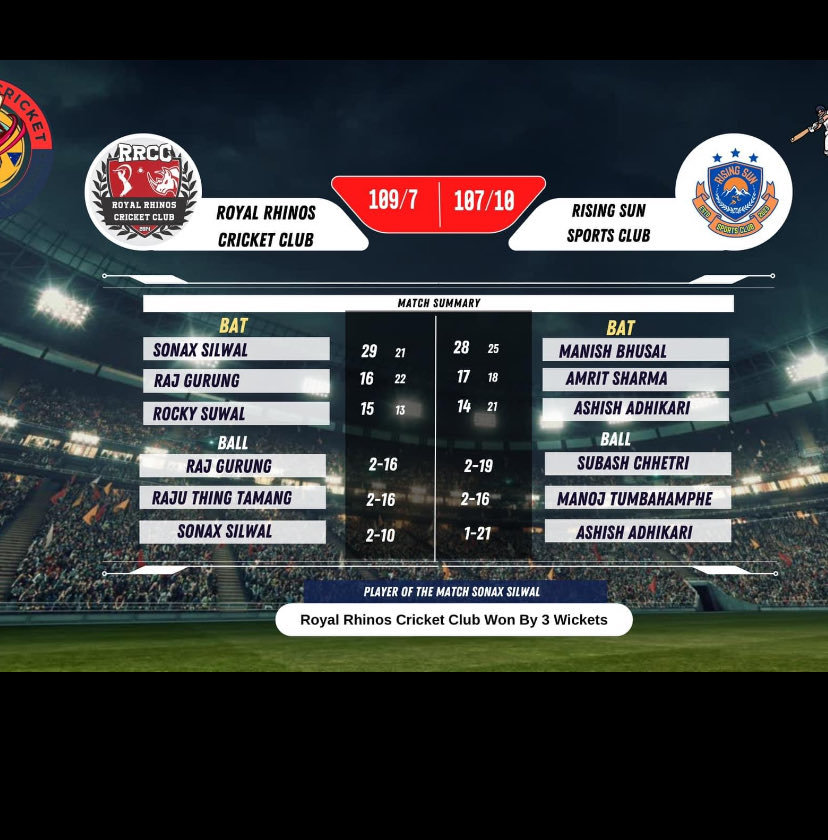 अघिल्लो आइतवार सम्पन्न भएको फाइनल प्रतियोगितामा राइजिंग सन स्पोर्टसलाई ३ विकेटले हराउँदै रोयल राइनोजले उपाधि जितेको हो । उक्त खेलको म्यान अफ द म्याच सोनाक्स सिलवाल भएका छन् । एभरेष्ट होम लोन्स एन्ड फाइनान्सको मुख्य प्रायोजन रहेको उक्त प्रतियोगितामा ५ क्रिकेट क्लबहरुको सहभागिता रहेको थियो।