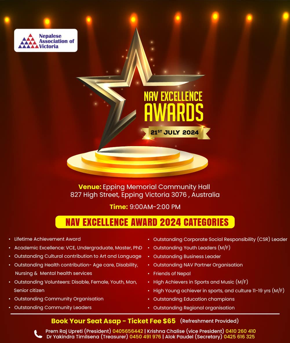 मेलवर्न । नेपाली संघ भिक्टोरिया (न्याभ)द्वारा हरेक दुई बर्षमा आयोजना हुने ‘न्याभ एक्सिलेन्स अवार्ड’ यस बर्ष पनि हुँदैछ ।