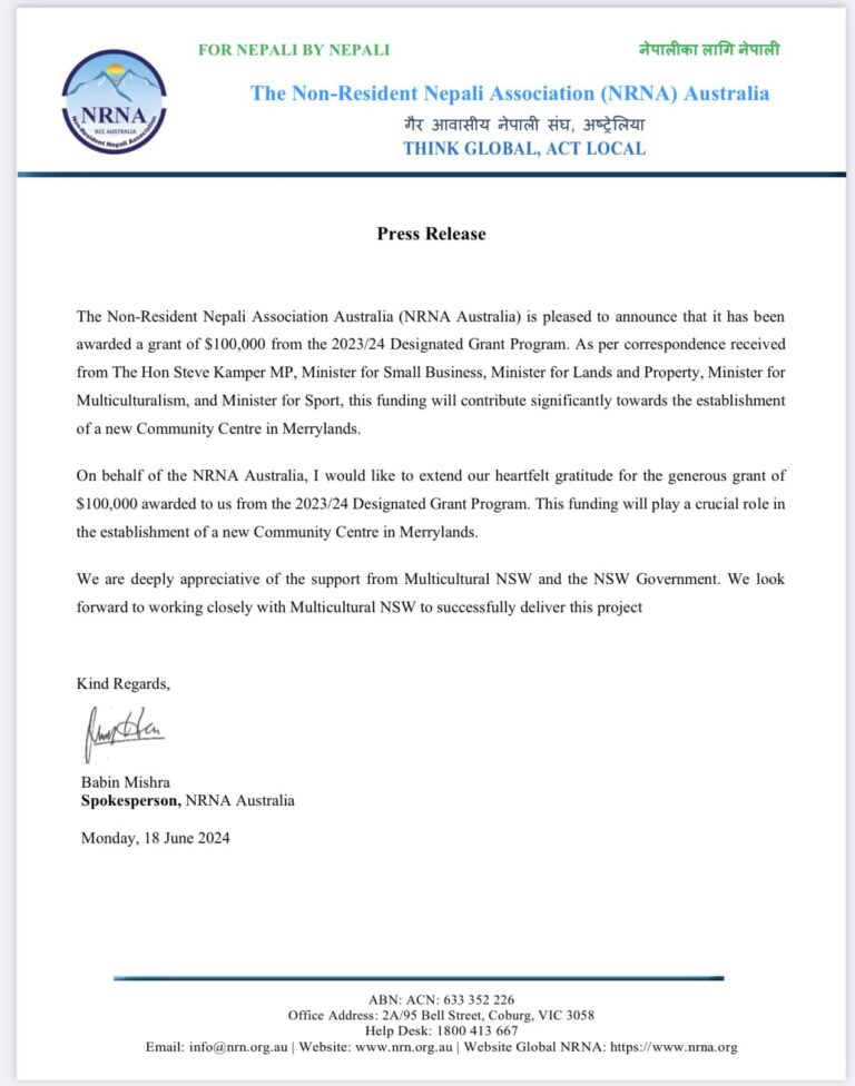 सिड्नी। गैरआवासीय नेपाली संघ (एनआरएनए)लाई न्यू साउथ वेल्स सरकारले १ लाख डलर अनुदान प्रदान गरेको छ ।