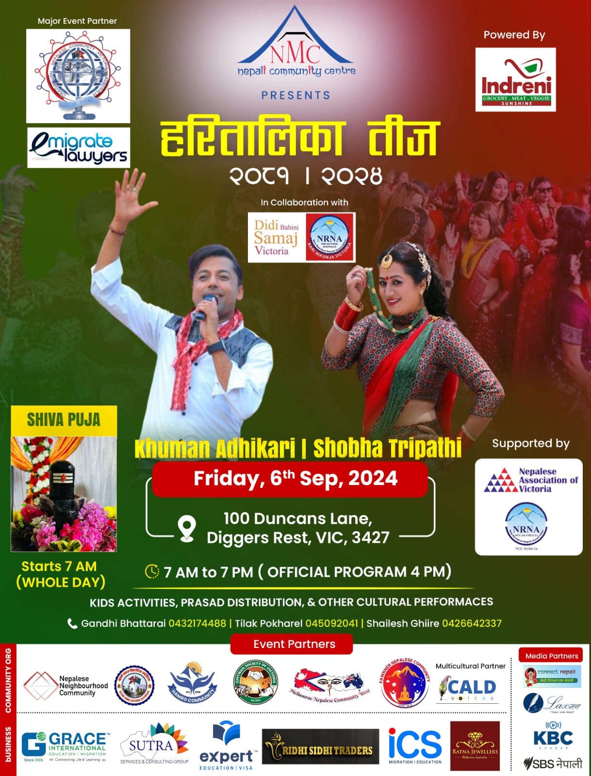 तीजको दिन ६ सेप्टेम्बर शुक्रवार अष्ट्रेलियन नेप्लिज मल्टीकल्चरल सेन्टर (एएनएमसी)को बहुसांस्कृतिक केन्द्रमा नेपालबाट अतिथिको रुपमा बहुचर्चित नेपाली कलाकारहरुसहित भव्य रुपमा नेपाली चेलीहरुको महान पर्व हरितालिका तीज मनाइने भएको हो । भिक्टोरियामा रहेका सबै नेपाली समुदायहरुको विशेष उपस्थितीमा भव्य पूजाआजासहित नाँचगान कार्यक्रम आयोजना गरिएको एएनएमसीका अध्यक्ष गान्धीप्रसाद भट्टराईले जानकारी दिए ।