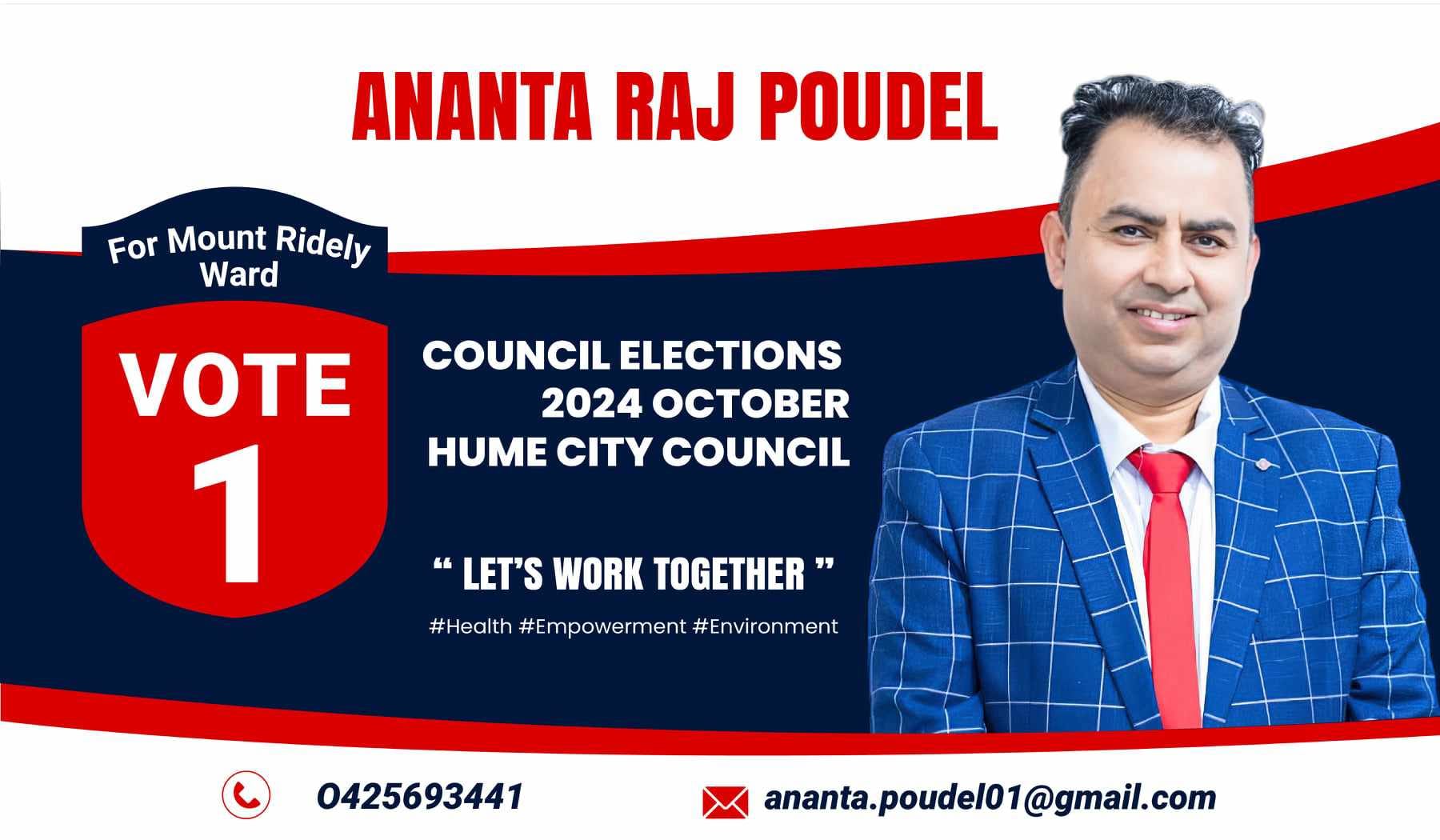 मेलवर्न । आगामी अक्टोबरमा हुन लागेको स्थानीय चुनावमा मेलवर्नमा अनन्त पौडेलले उम्मेद्वारी घोषणा गरेका छन् । यही ८ अक्टोबरदेखि २५ अक्टोबरसम्म हुन गइरहेको स्थानीय चुनावमा ह्युम काउन्सिलको माउन्ट रिड्ली वार्डमा पौडेलले स्वतन्त्र रुपमा काउन्सिलरको लागि दावी पेश गरेका हुन् ।