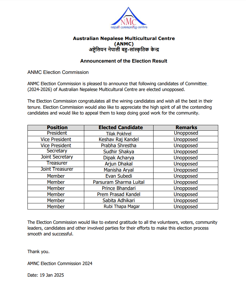 मेलवर्न । अष्ट्रेलियाली नेपाली बहुसांस्कृतिक केन्द्र (एएनएमसी)को अध्यक्षमा डा. तिलक पोखरेल निर्विरोध निर्वाचित भएका छन् । आइतवार निर्वाचन समितिले सार्वजनिक गरेको निर्वाचन परिणाम अनुसार पोखरेलको अध्यक्षतामा १३ सदस्यीय कार्यसमितिनै निर्विरोध निर्वाचित भएको हो ।