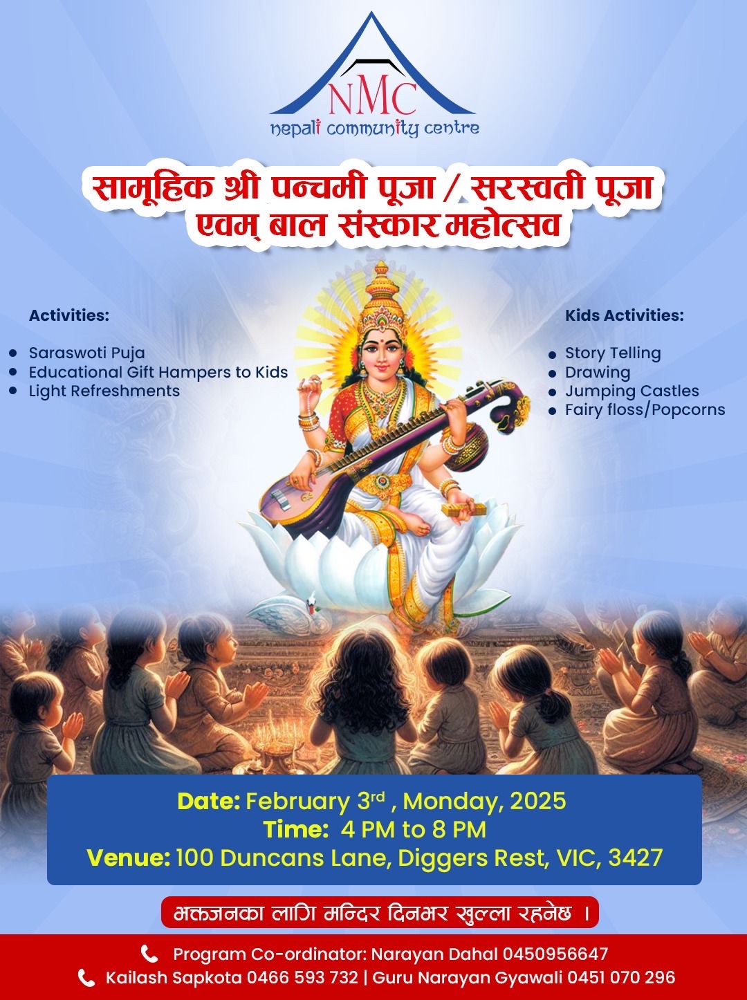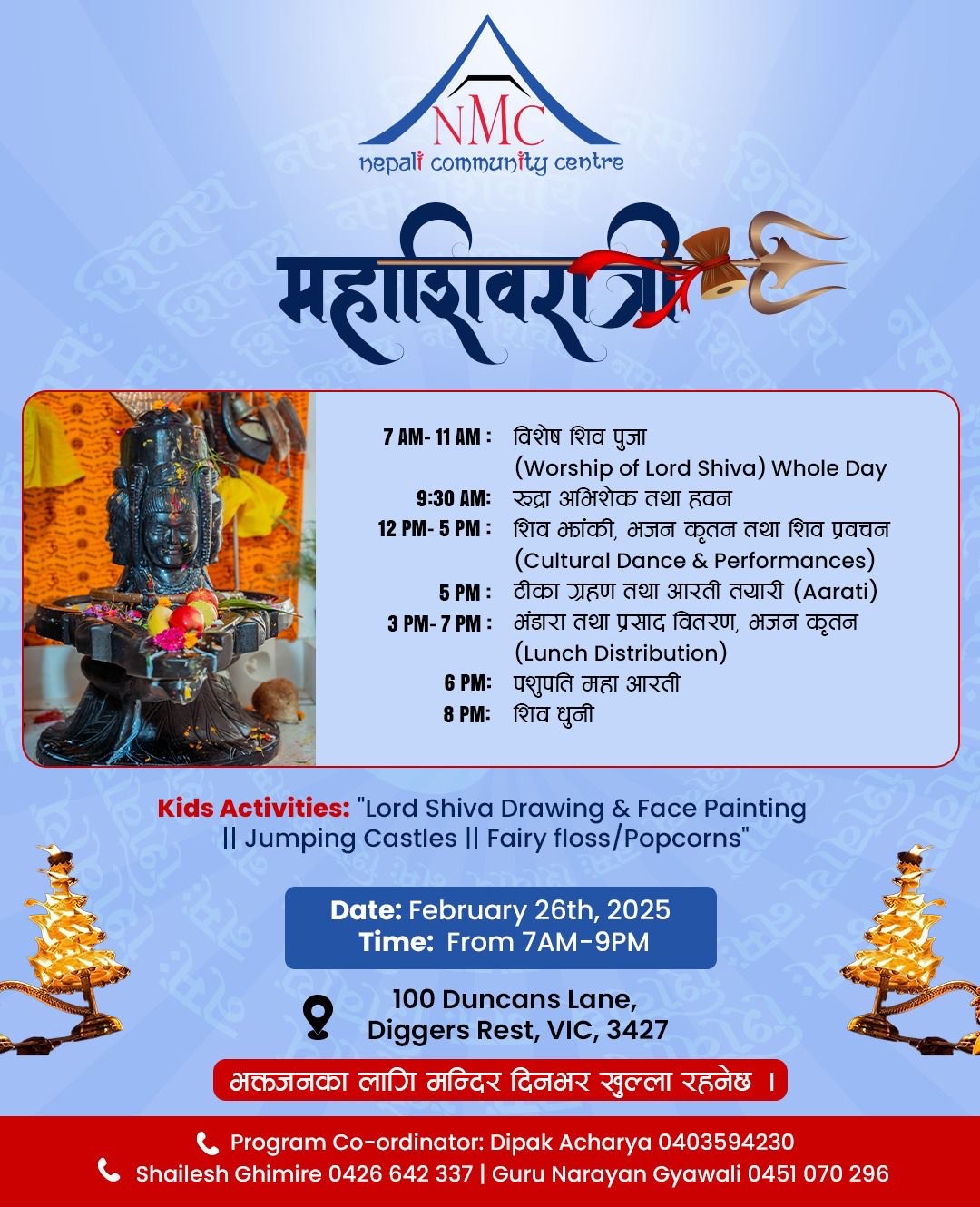 मेलवर्न । अष्ट्रेलियाली नेपाली बहुसांस्कृतिक केन्द्र (एएनएमसी)मा महाशिवरात्री र सरस्वती पूजाको विशेष तयारी भइरहेको छ । यही २६ फेब्रुअरीको दिन महाशिवरात्री पूजा र ३ फेब्रुअरीको दिन सामूहिक श्रीपञ्चमी, सरस्वतीपूजा र बाल संस्कार महोत्सव भव्यताका साथ मनाउन लागिएको एएनएमसीका अध्यक्ष गान्धी प्रसाद भट्टराईले जानकारी दिए ।