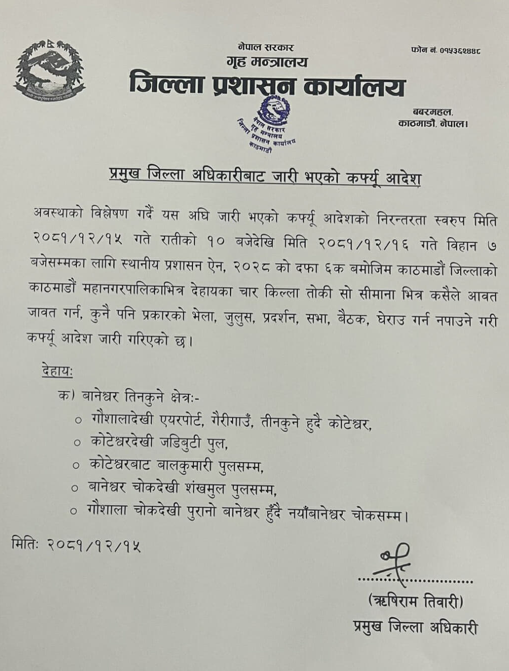 प्रमुख जिल्ला अधिकारी ऋषिराम तिवारीका अनुसार, आज राति १० बजेसम्मका लागि जारी भएको कर्फ्यूको समय भोलि बिहानसम्मका लागि थप गरिएको हो । काठमाडौँ महानगरपालिका भित्रका विभिन्न स्थानमा चार किल्ला तोकी सो सिमानाभित्र कसैले आवतजावत गर्न, कुनै प्रकारको भेला, जुलुस, प्रदर्शन, सभा, बैठक, घेराउ गर्न नपाउने गरी कर्फ्यू आदेश जारी गरिएको छ ।
