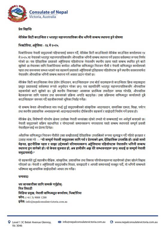 भिक्टोरियामा नेपाली समुदायको पहिचानलाई सम्मान गर्दै मेरिबेक काउन्सिलले १४ मे २०२५ को दिन भरतपुर महानगरपालिकासँग भगिनी सम्बन्ध स्थापना गर्ने प्रस्ताव पारित गरेको हो ।