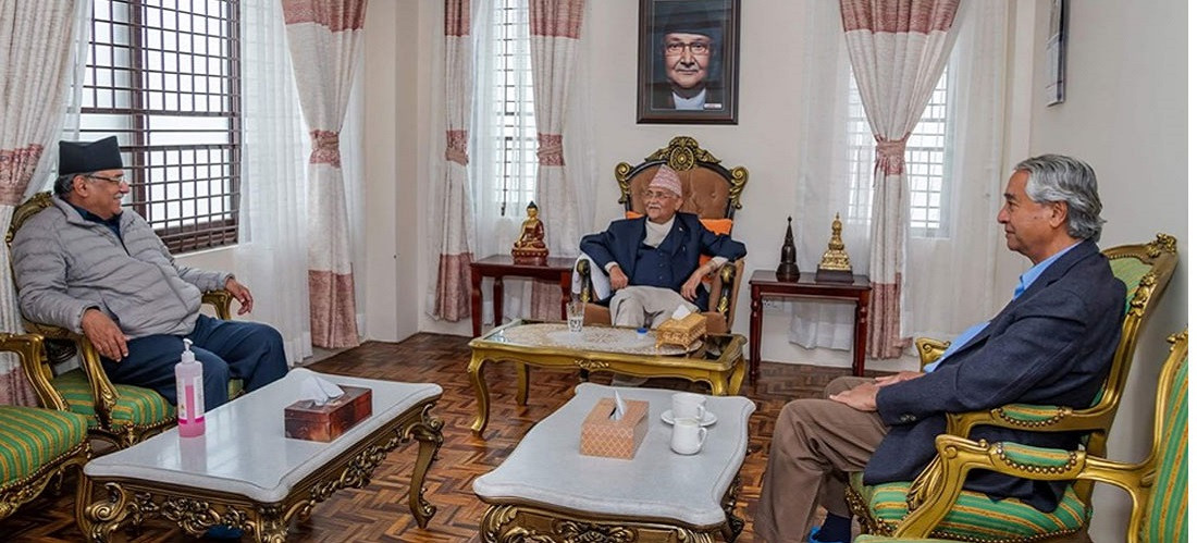 ओली, प्रचण्ड र देउवाबीच भेटवार्ता जारी